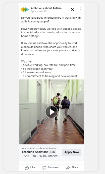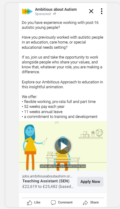 1. Campaign Execution: Over three months, Prospectus ran the social media campaign to raise awareness of TA vacancies at Ambitious College. The campaign aimed to drive traffic to the recruitment website and position Ambitious about Autism as an employer of choice.